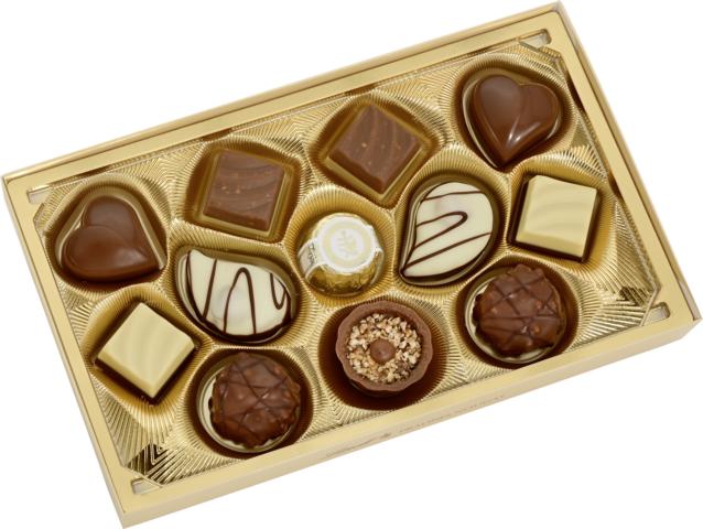 Zucker, Kakaomasse, Kakaobutter, Butterreinfett, Glukosesirup, Vollmilchpulver, Invertzuckersirup, Marc de Champagne, Vollmilch, Milchzucker, Magermilchpulver, Kakaokerne, Emulgator (Sojalecithin), Haselnüsse, Zitronensaftkonzentrat, Traubenzucker, Himbeerpüree, Feuchthaltemittel (Sorbit), natürliche Aromen, Glukose-Fruktose-Sirup, Kirschsaft aus Konzentrat, Aromen, Orangensaftkonzentrat, natürliches Orangenaroma, Orangen, Frucht- undPflanzenkonzentrat (Rettich, Apfel, Spirulina, schwarze Johannisbeere), Salz, Überzugsmittel (Gummi arabicum), Gerstenmalzextrakt, Verdickungsmittel (Pektin).