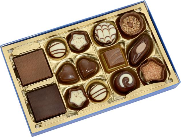Zucker, Kakaobutter, Kakaomasse, Vollmilchpulver, Haselnüsse, Mandeln, Milchzucker, Magermilchpulver, Glukosesirup, Butterreinfett, Palmöl, Kakaokerne, Invertzuckersirup, Vollmilch, Marc de Champagne, Glukose-Fruktose-Sirup, Emulgator (Soja- und Sonnenblumenlecithin), Sahnepulver, Orangenschalen, Zitronenschalen, Alkohol, Zitronensaftkonzentrat, Himbeerpüree, Kaffee, Gerstenmalzextrakt, Traubenzucker, natürliche Aromen, Kirschsaftkonzentrat, Aromen, Weizenmehl, Frucht- und Pflanzenkonzentrate (Rettich, Apfel, schwarze Johannisbeere, Spirulina), Feuchthaltemittel (Invertase), Eiklar, Salz, fettarmes Kakaopulver, Säuerungsmittel (Citronensäure), Aprikosenkerne, natürliches Orangenaroma.