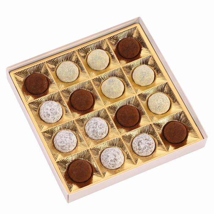 Schokolade, Milchschokolade und weiße Schokolade mit verschiedenen Trüffelfüllungen (44%)