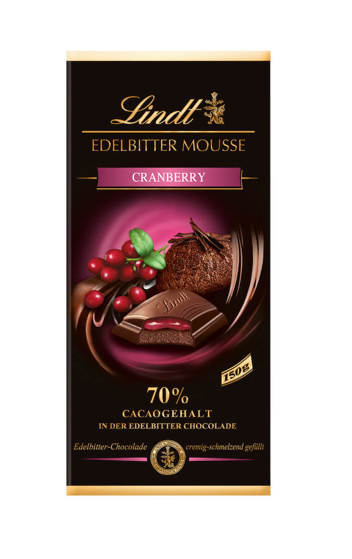 Kakaomasse, Zucker, Cranberrypüree (7%), Kakaobutter, Glukose- Sirup, Butterreinfett, Invertzuckersirup, Emulgator (Sojalecithin), Zitronensaft, natürliches Aroma.
