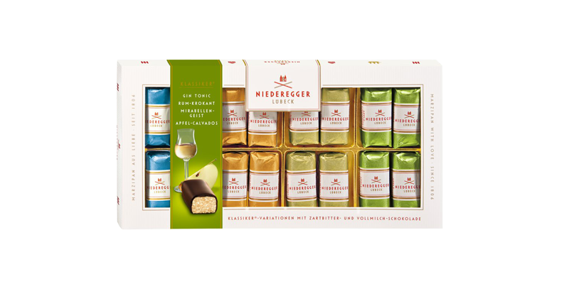 Mandeln 38%, Zucker, Vollmilch-Schokolade 14% (Zucker, Kakaobutter, Vollmilchpulver, Kakaomasse, Emulgator: Soja-Lecithine, Vanille-Extrakt), Zartbitter-Schokolade 14% (Kakaomasse, Zucker, Kakaobutter, Vollmilchpulver, Emulgator: Soja-Lecithine, Vanille-Extrakt), Invertzuckersirup, Apfel 0,9%, Rum 0,7%, Haselnüsse 0,7%, Alkohol, Mirabellenwasser 0,5%, Gin 0,5%, natürliche Aromen, Glukose-Fruktose-Sirup, Calvados 0,3%, Natürliches Apfel-Aroma mit anderen natürlichen Aromen, Getrocknete Zitronenzubereitung (Dextrose, Maltodextrin, Säuerungsmittel: Zitronensäure, Zitronensaftkonzentrat), Säuerungsmittel: Zitronensäure